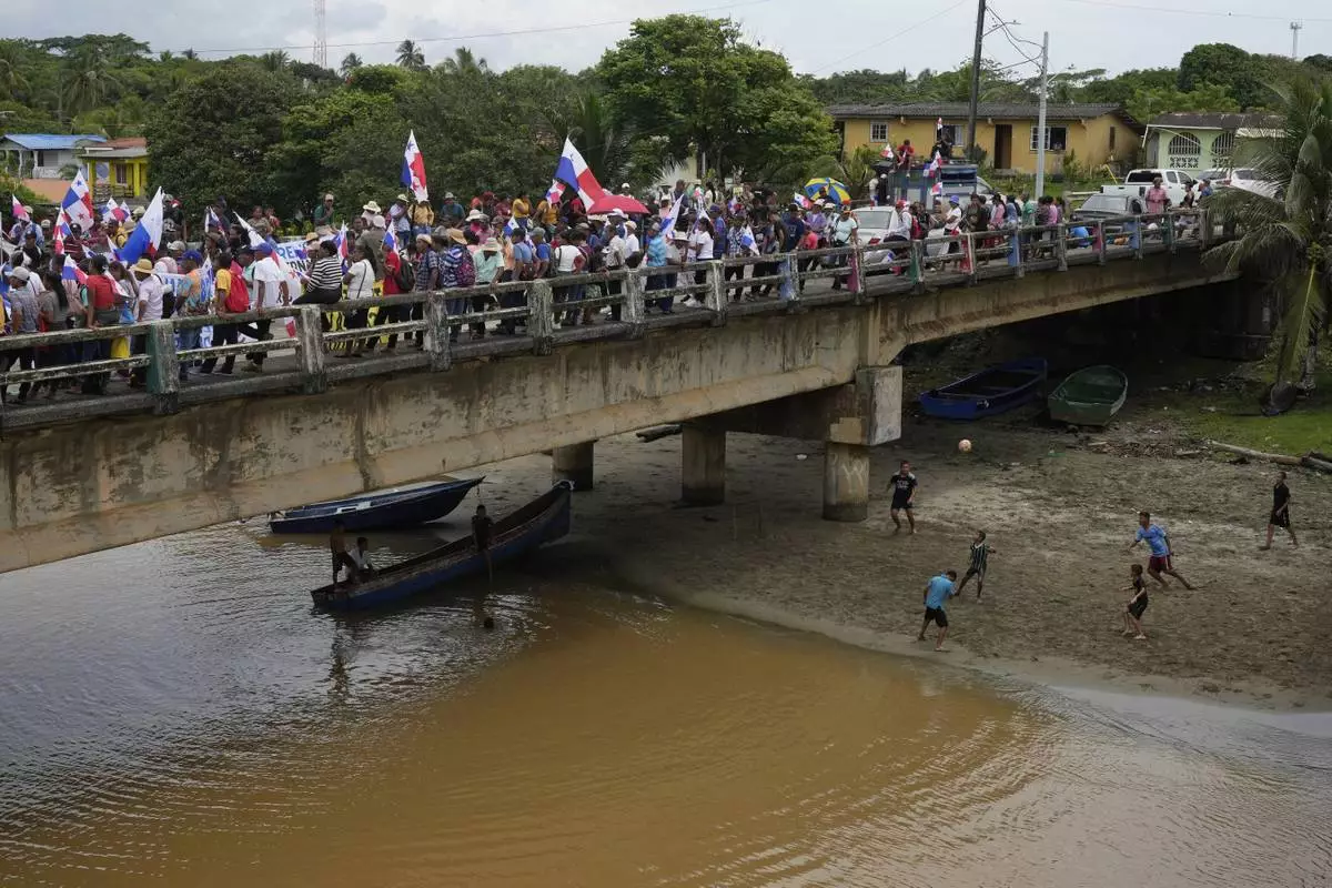 Children play soccer as demonstrators protest a planned reservoir for the Panama Canal at the mouth of the Indio River on Panama's Caribbean coast, Friday, May 16, 2025. (AP Photo/Matias Delacroix)