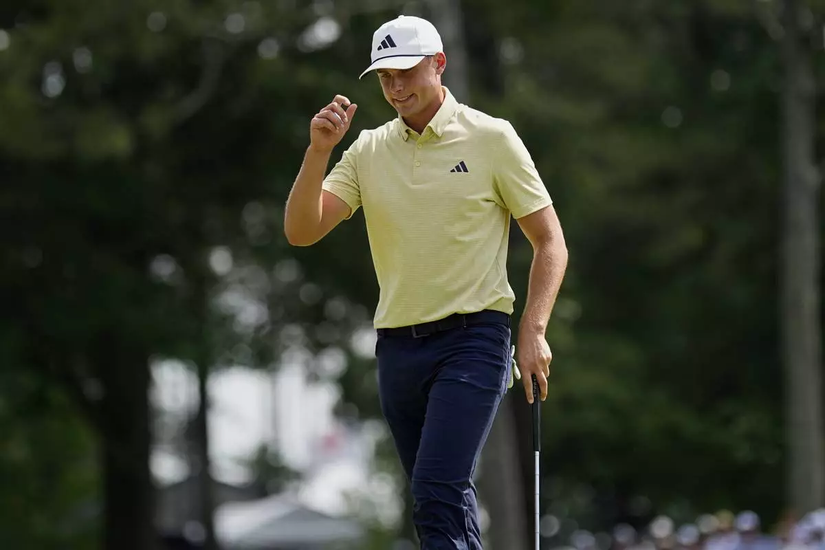 Ludvig Åberg, of Sweden, waves after making a putt on the ninth hole during the first round of the PGA Championship golf tournament at the Quail Hollow Club, Thursday, May 15, 2025, in Charlotte, N.C. (AP Photo/George Walker IV)