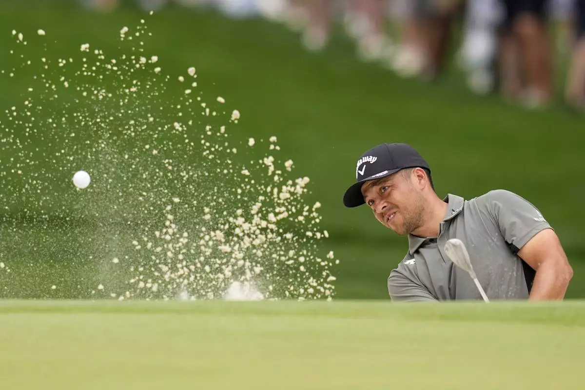 Xander Schauffele hits from the bunker on the sixth hole during the second round of the PGA Championship golf tournament at the Quail Hollow Club, Friday, May 16, 2025, in Charlotte, N.C. (AP Photo/David J. Phillip)