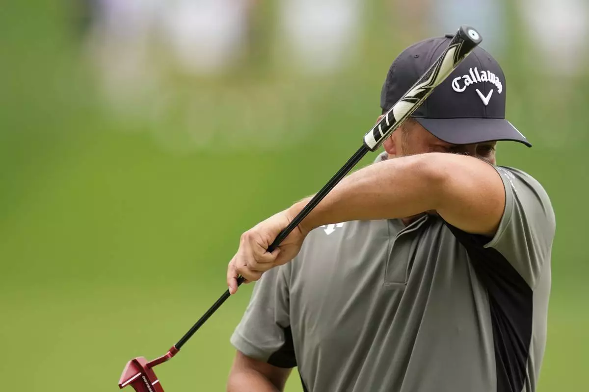 Xander Schauffele wipes his face on the sixth hole during the second round of the PGA Championship golf tournament at the Quail Hollow Club, Friday, May 16, 2025, in Charlotte, N.C. (AP Photo/David J. Phillip)