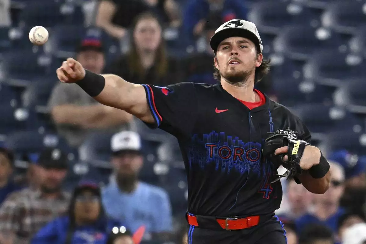 Toronto Blue Jays third baseman Addison Barger throws to first base against the Detroit Tigers in sixth-inning baseball game action in Toronto, Friday, May 16, 2025. (/Jon Blacker/The Canadian Press via AP)