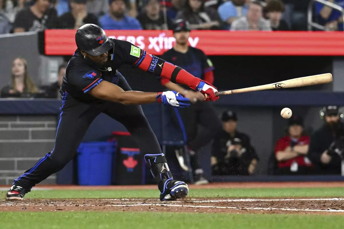 Toronto Blue Jays; Vladimir Guerrero Jr. hits a single against the Detroit Tigers in sixth-inning baseball game action in Toronto, Friday, May 16, 2025. (/Jon Blacker/The Canadian Press via AP)