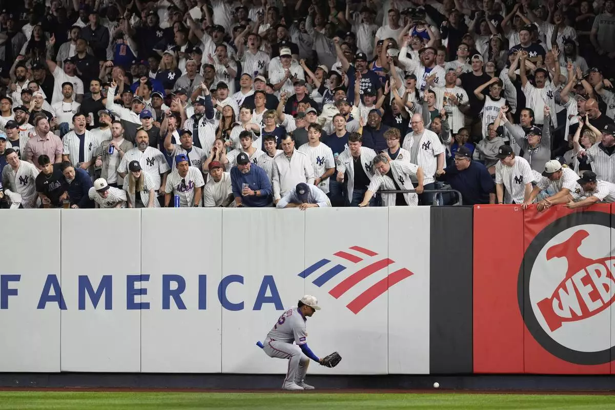 Fans watch as New York Mets outfielder Juan Soto plays a ball off the wall during the fourth inning of a baseball game Friday, May 16, 2025, in New York. (AP Photo/Seth Wenig)