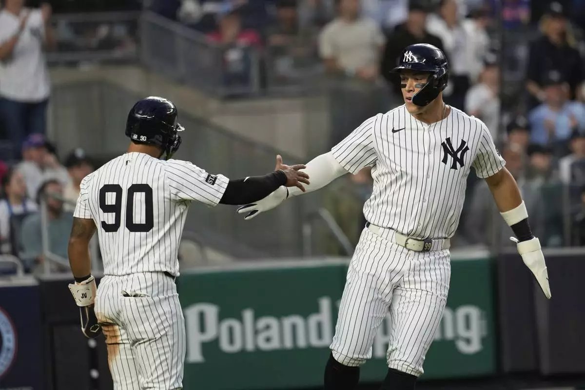 New York Yankees' Aaron Judge, right, celebrates with Jorbit Vivas (90) after they scored on a hit by Paul Goldschmidt during the third inning of a baseball game against the New York Mets Friday, May 16, 2025, in New York. (AP Photo/Seth Wenig)
