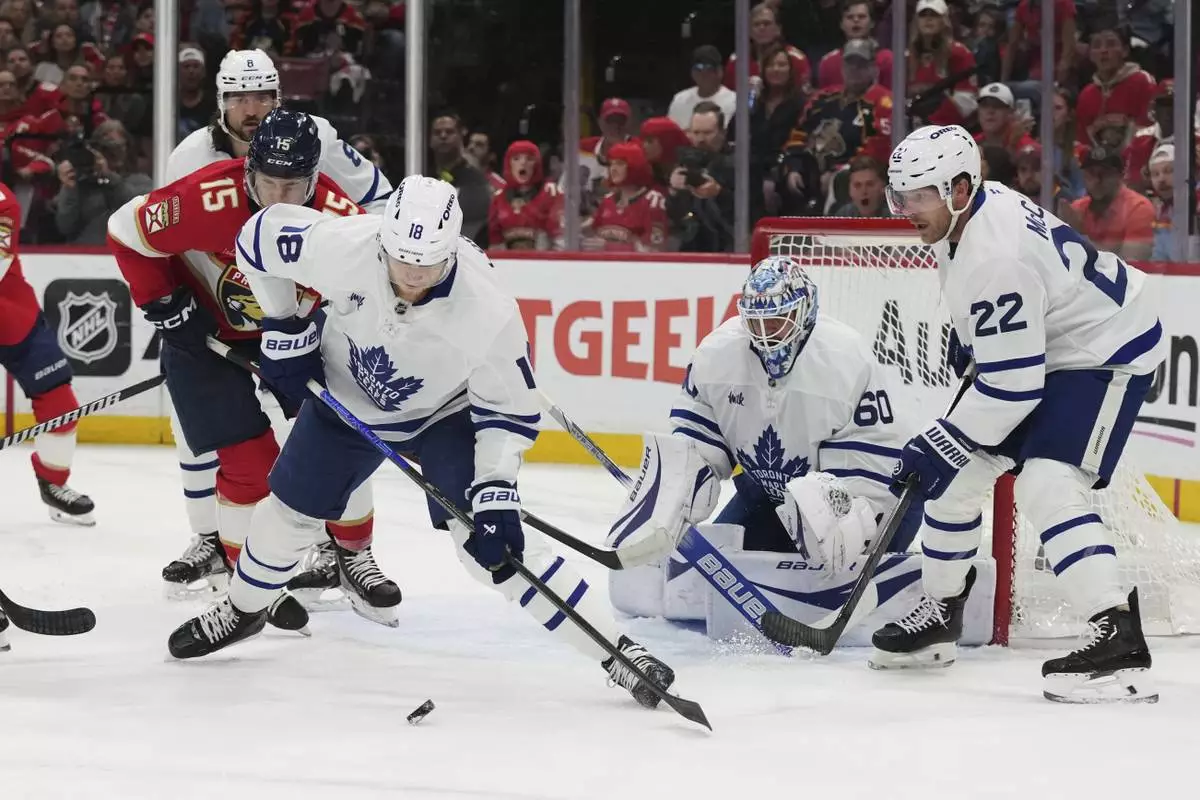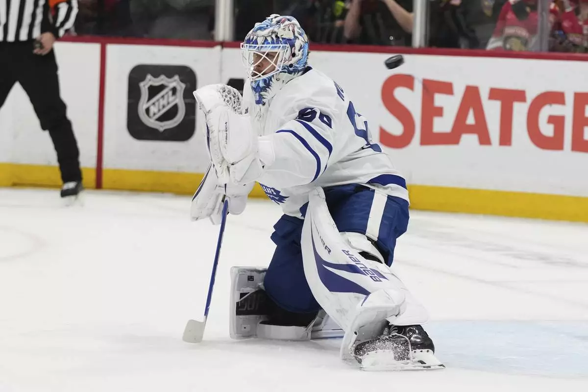 Toronto Maple Leafs goaltender Joseph Woll (60) defends the goal during the first period in Game 6 of a second-round NHL hockey playoff series against the Florida Panthers, Friday, May 16, 2025, in Sunrise, Fla. (AP Photo/Lynne Sladky)