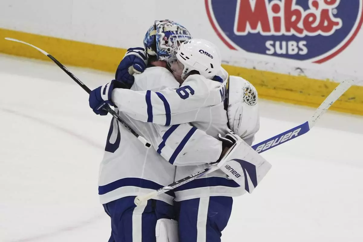 Toronto Maple Leafs goaltender Joseph Woll, left, is hugged by right wing Mitch Marner (16) after the Maple Leafs defeated the Florida Panthers in Game 6 of a second-round NHL hockey playoff series, Friday, May 16, 2025, in Sunrise, Fla. (AP Photo/Lynne Sladky)