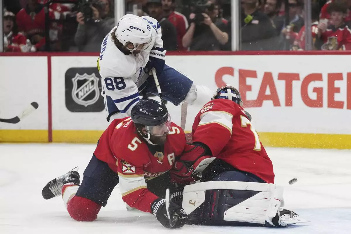 Florida Panthers defenseman Aaron Ekblad (5) and goaltender Sergei Bobrovsky, right, defend the goal against Toronto Maple Leafs right wing William Nylander (88) during the second period in Game 6 of a second-round NHL hockey playoff series, Friday, May 16, 2025, in Sunrise, Fla. (AP Photo/Lynne Sladky)