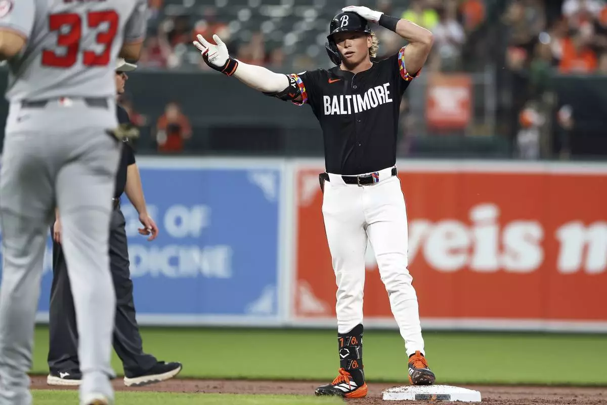 Baltimore Orioles' Jackson Holliday celebrates after hitting a double during the second inning of a baseball game against the Washington Nationals, Friday, May 16, 2025, in Baltimore (AP Photo/Daniel Kucin Jr.)