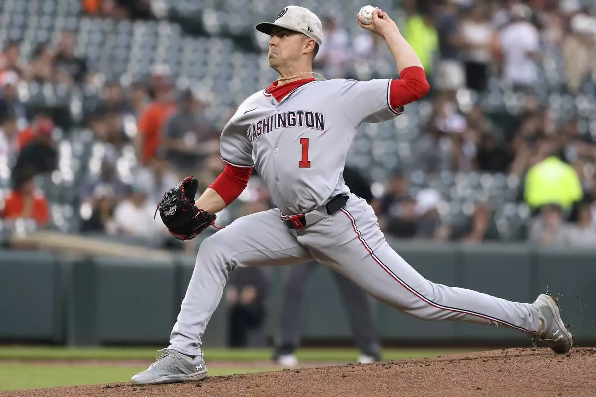 Washington Nationals pitcher MacKenzie Gore throws during the first inning of a baseball game against the Baltimore Orioles, Friday, May 16, 2025, in Baltimore (AP Photo/Daniel Kucin Jr.)