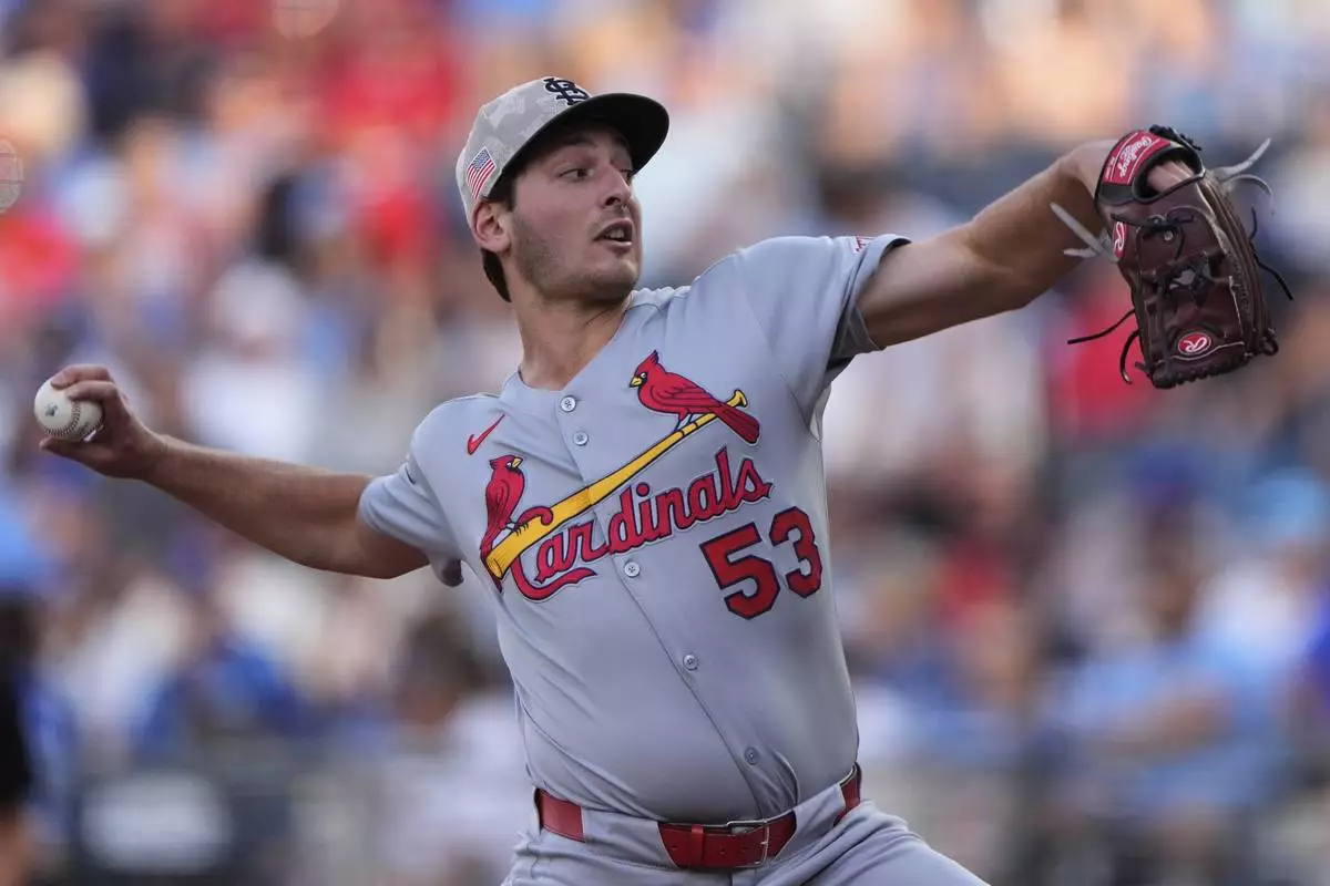 St. Louis Cardinals starting pitcher Andre Pallante throws during the first inning of a baseball game against the Kansas City Royals, Friday, May 16, 2025, in Kansas City, Mo. (AP Photo/Charlie Riedel)