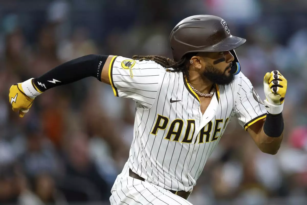 San Diego Padres' Fernando Tatis Jr. runs after hitting a single during the third inning of a baseball game against the Seattle Mariners Friday, May 16, 2025, in San Diego. (AP Photo/Brandon Sloter)