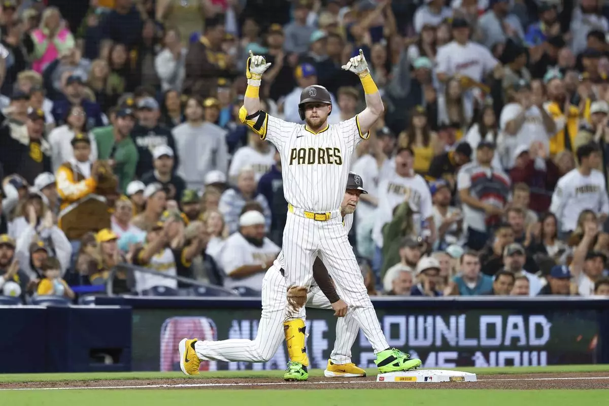 San Diego Padres' Jake Cronenworth celebrates on third base after hitting a triple during the fourth inning of a baseball game against the Seattle Mariners, Friday, May 16, 2025, in San Diego. (AP Photo/Brandon Sloter)