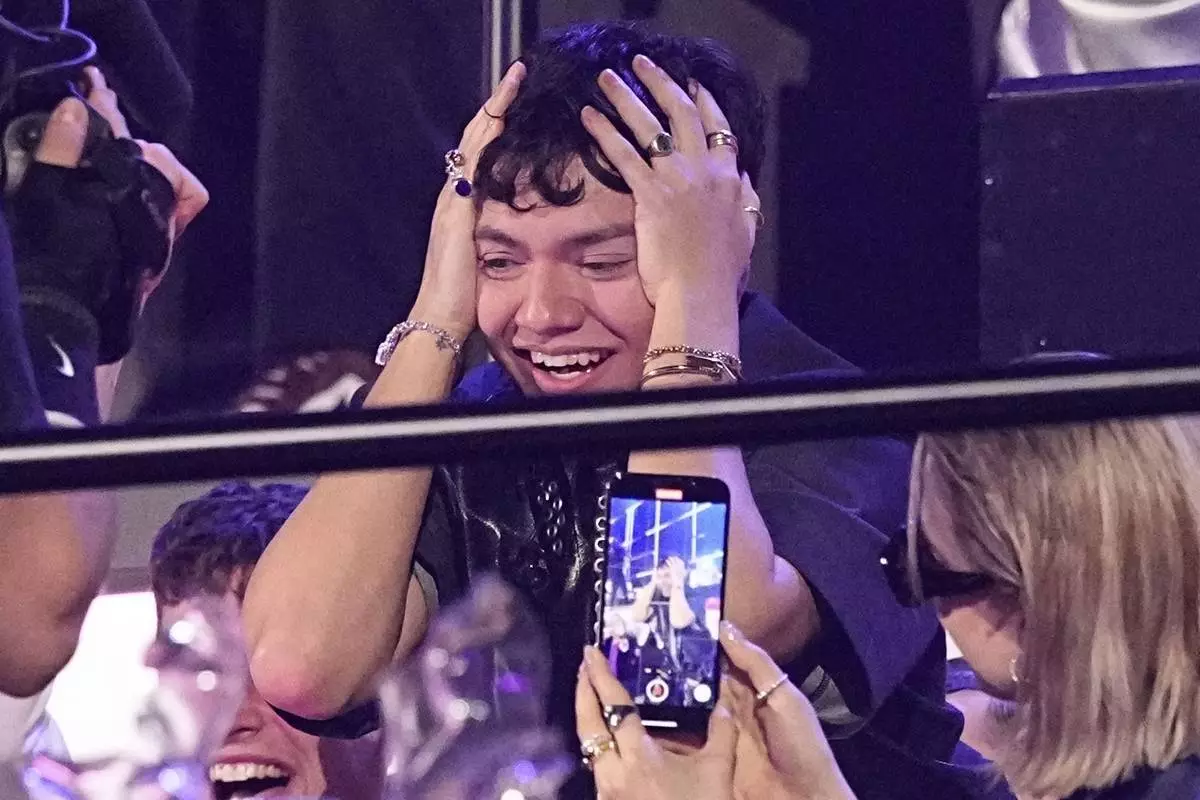 JJ from Austria who performed the song "Wasted Love" reacts to voting during the Grand Final of the 69th Eurovision Song Contest, in Basel, Switzerland, Saturday, May 17, 2025. (AP Photo/Martin Meissner)