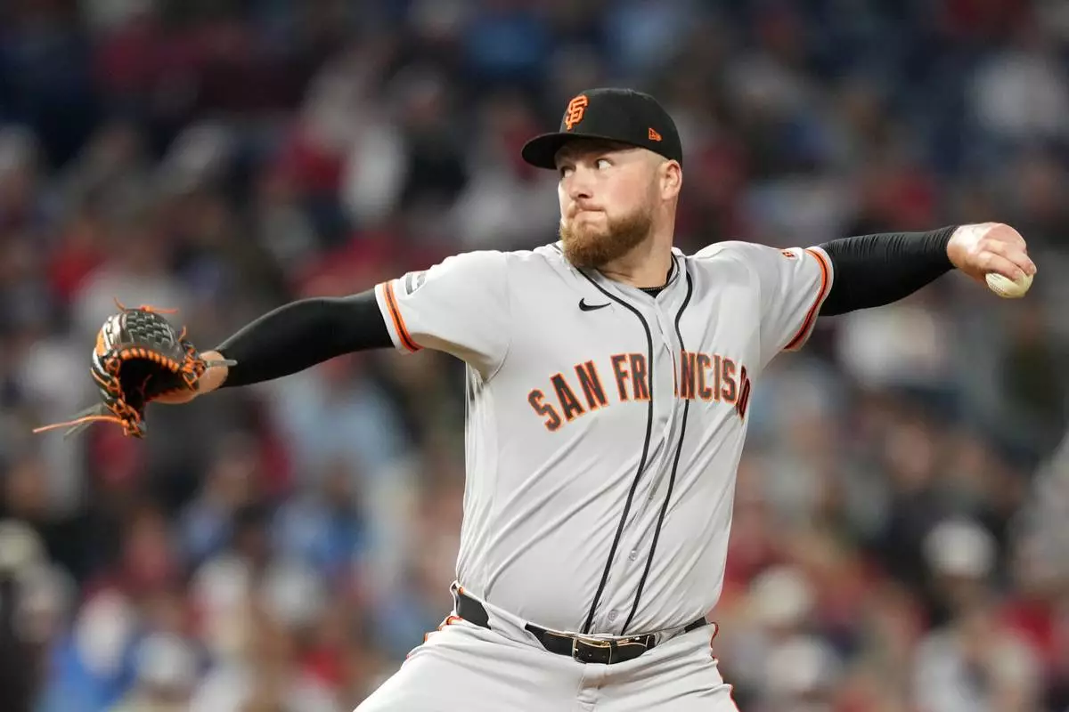San Francisco Giants' Matt Gage pitches during the sixth inning of a baseball game against the Philadelphia Phillies Tuesday, April 28, 2026, in Philadelphia. (AP Photo/Matt Slocum)