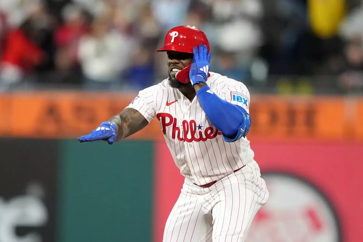 Philadelphia Phillies' Adolis García reacts after hitting a two-run double against San Francisco Giants pitcher Tyler Mahle during the sixth inning of a baseball game Tuesday, April 28, 2026, in Philadelphia. (AP Photo/Matt Slocum)
