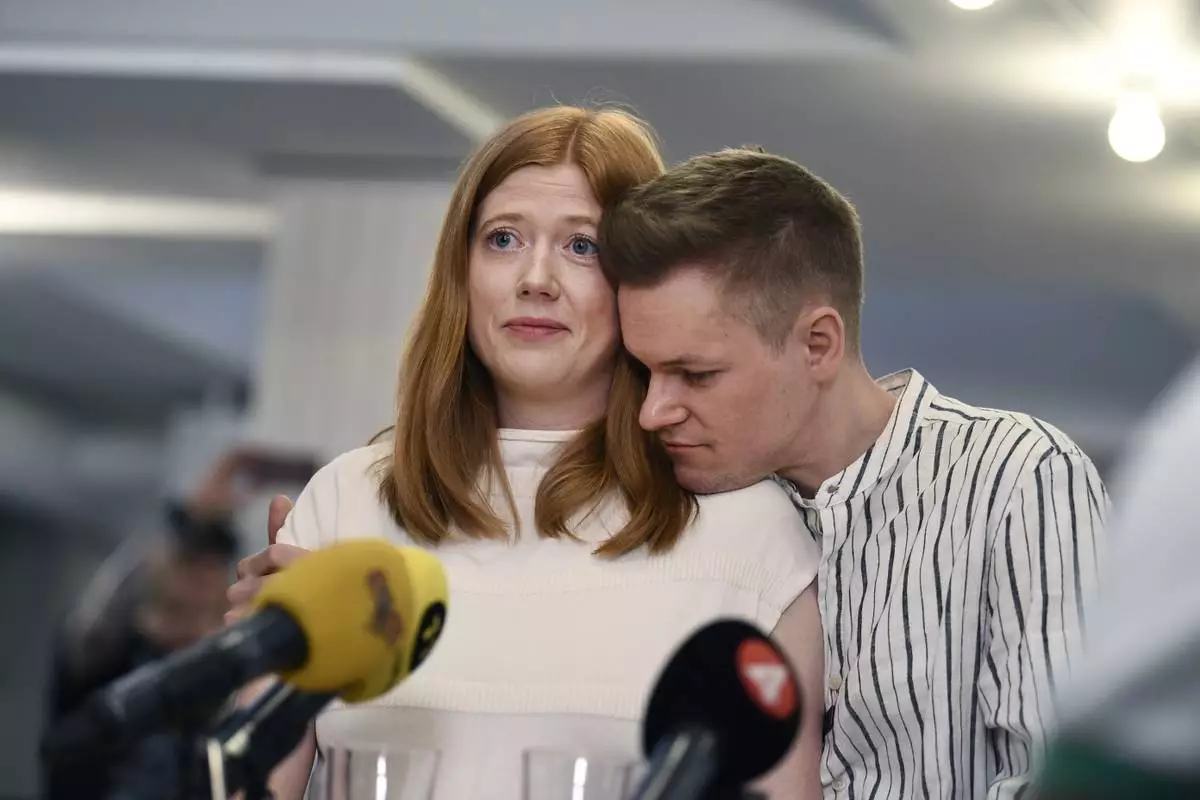 Swedish journalist Joakim Medin with his wife journalist Sofie Axelsson attends a press conference in Stockholm, Sweden, Saturday May 17, 2025. (Oscar Olsson/TT via AP)