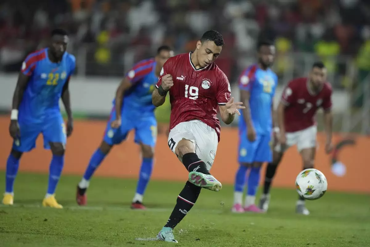 FILE -Egypt's Mostafa Mohamed scores his side's first goal with a penalty kick during the African Cup of Nations Round of 16 soccer match between Egypt and DR Congo, at the Laurent Pokou stadium in San Pedro, Ivory Coast, Jan. 28, 2024. 2024. (AP Photo/Sunday Alamba, File)