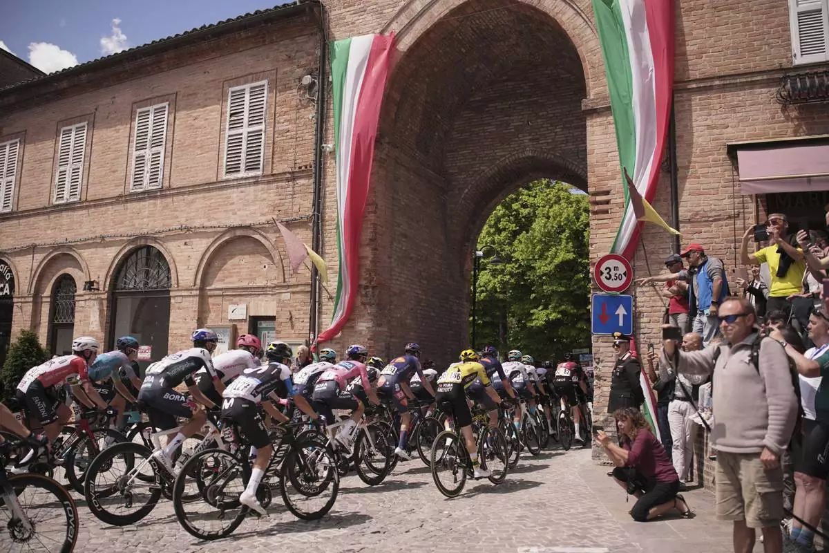 The pack rides during the 8th stage of the Giro d'Italia from Giulianova to Castelraimondo, Italy, Saturday May 17, 2025. (Marco Alpozzi/LaPresse via AP)