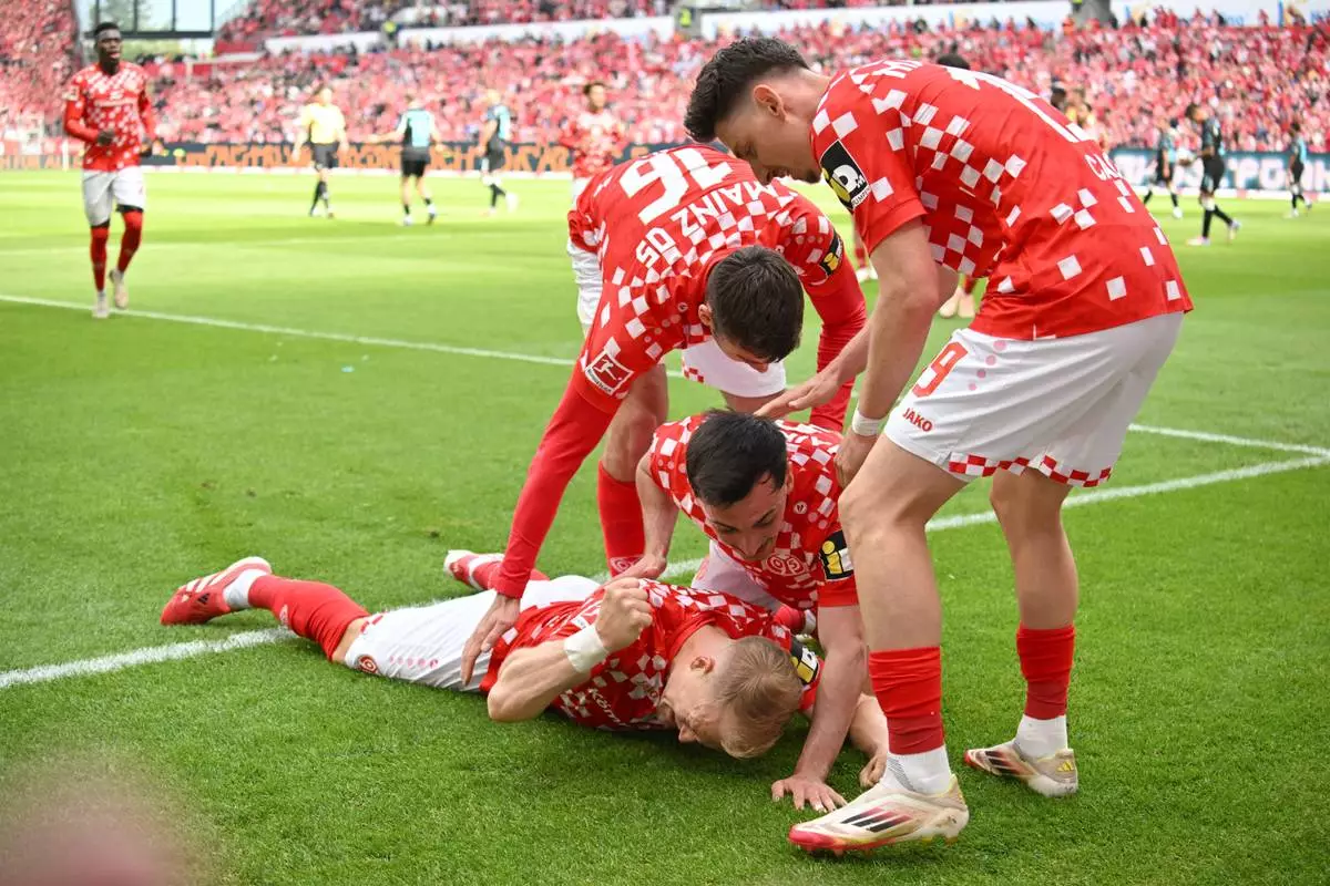 Mainz's Andreas Hanche-Olsen celebrates with his teammates after scoring a goal that was later disallowed, during the German Bundesliga soccer match between 1. FSV Mainz 05 and Bayer Leverkusen, at the Mewa Arena, in Mainz, Germany, Saturday, May 17, 2025. (Torsten Silz/dpa via AP)