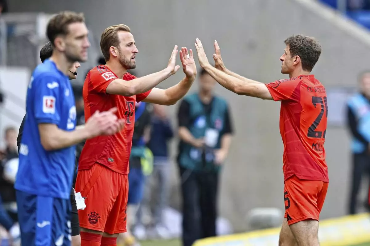 Bayern's Thomas Mueller, right, high fives teammate Harry Kane during his substitution in the German Bundesliga soccer match between TSG 1899 Hoffenheim and Bayern Munich at the PreZero Arena in Sinsheim, Germany, Saturday, May 17, 2025. (Uwe Anspach/dpa via AP)