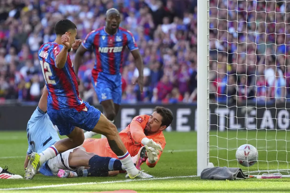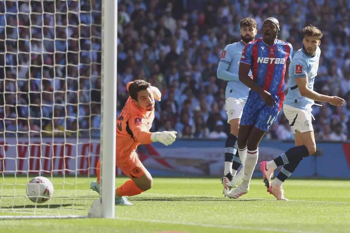 Manchester City's goalkeeper Stefan Ortega fails to save during the FA Cup final between Manchester City and Crystal Palace at the Wembley Stadium in London, Saturday, May 17, 2025. (AP Photo/Ian Walton)