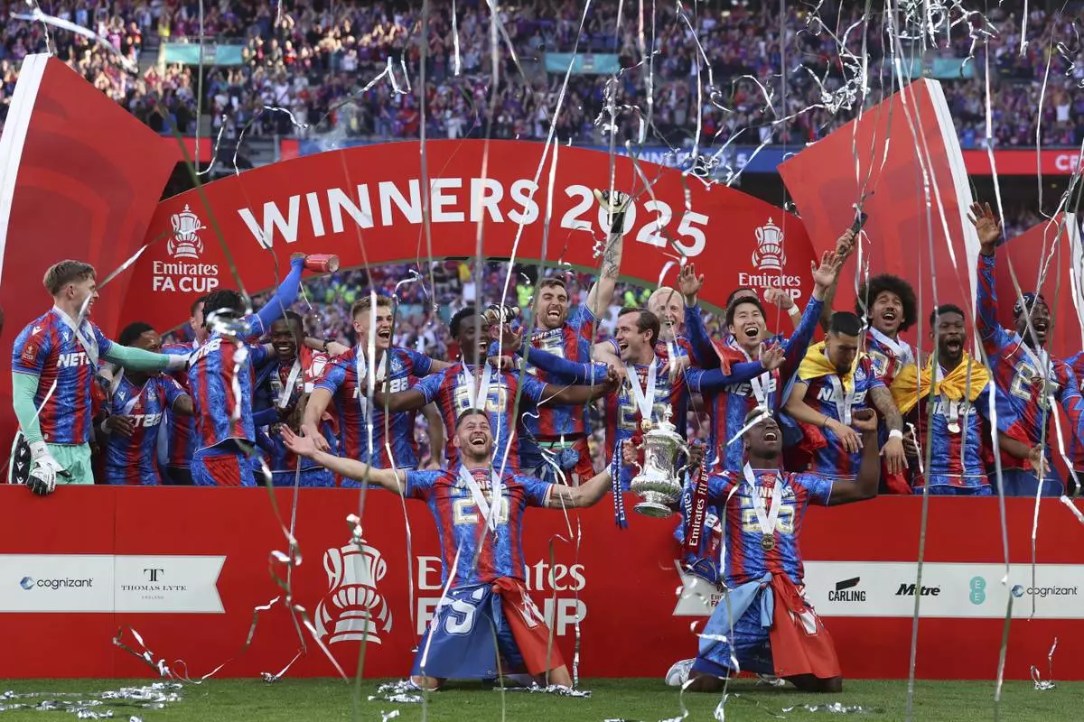 Crystal Palace players celebrate with the trophy after the FA Cup final between Manchester City and Crystal Palace at the Wembley Stadium in London, Saturday, May 17, 2025. (AP Photo/Ian Walton)