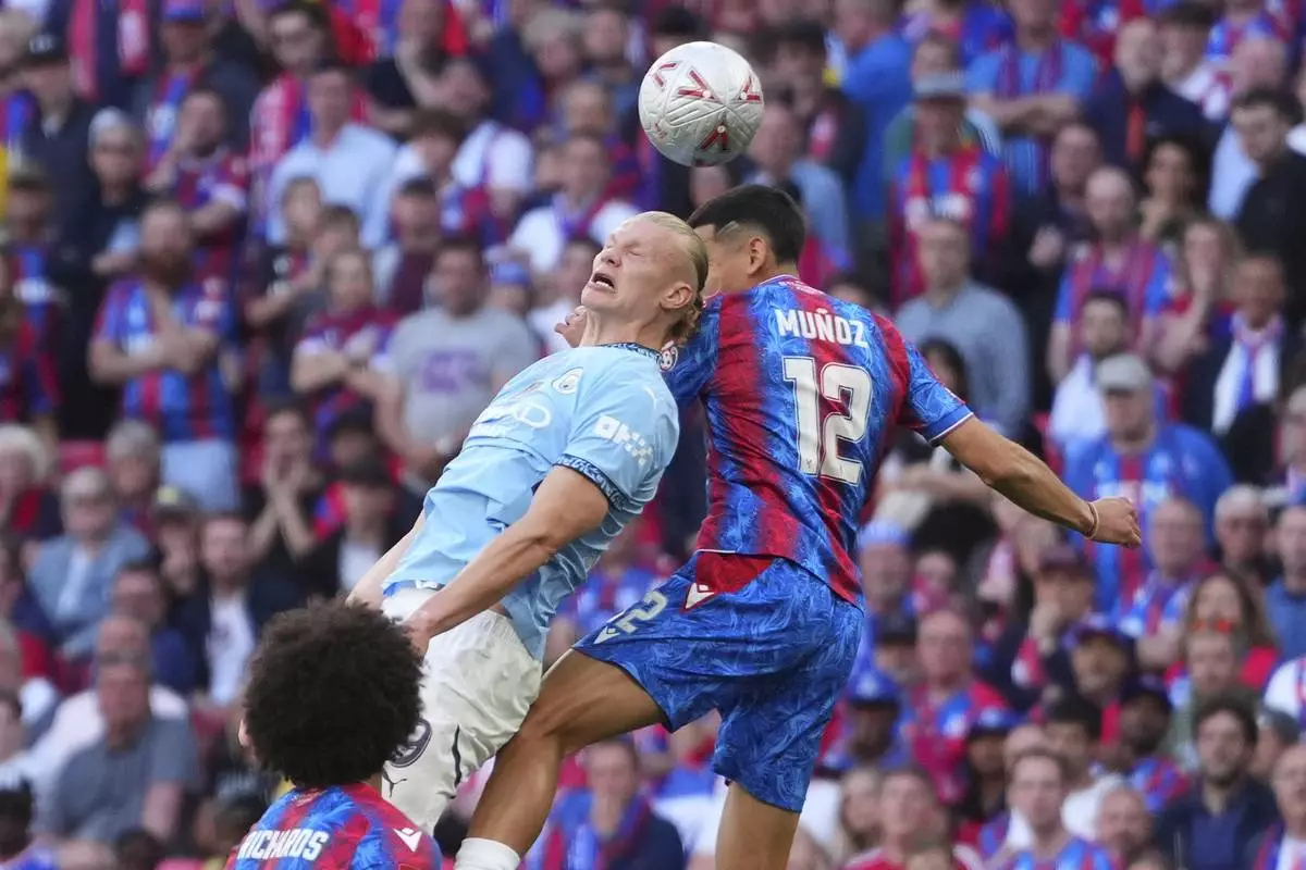 Manchester City's Erling Haaland, left, challenges for the ball with Crystal Palace's Daniel Munoz during the English FA Cup final soccer match between Crystal Palace and Manchester City at Wembley stadium in London, Saturday, May 17, 2025. (AP Photo/Kirsty Wigglesworth)