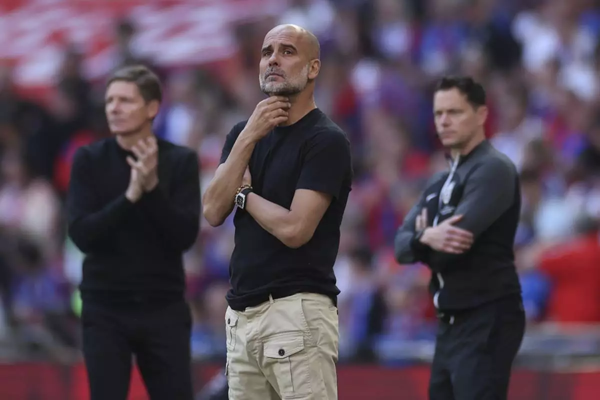 Manchester City's head coach Pep Guardiola reacts during the FA Cup final between Manchester City and Crystal Palace at the Wembley Stadium in London, Saturday, May 17, 2025. (AP Photo/Ian Walton)