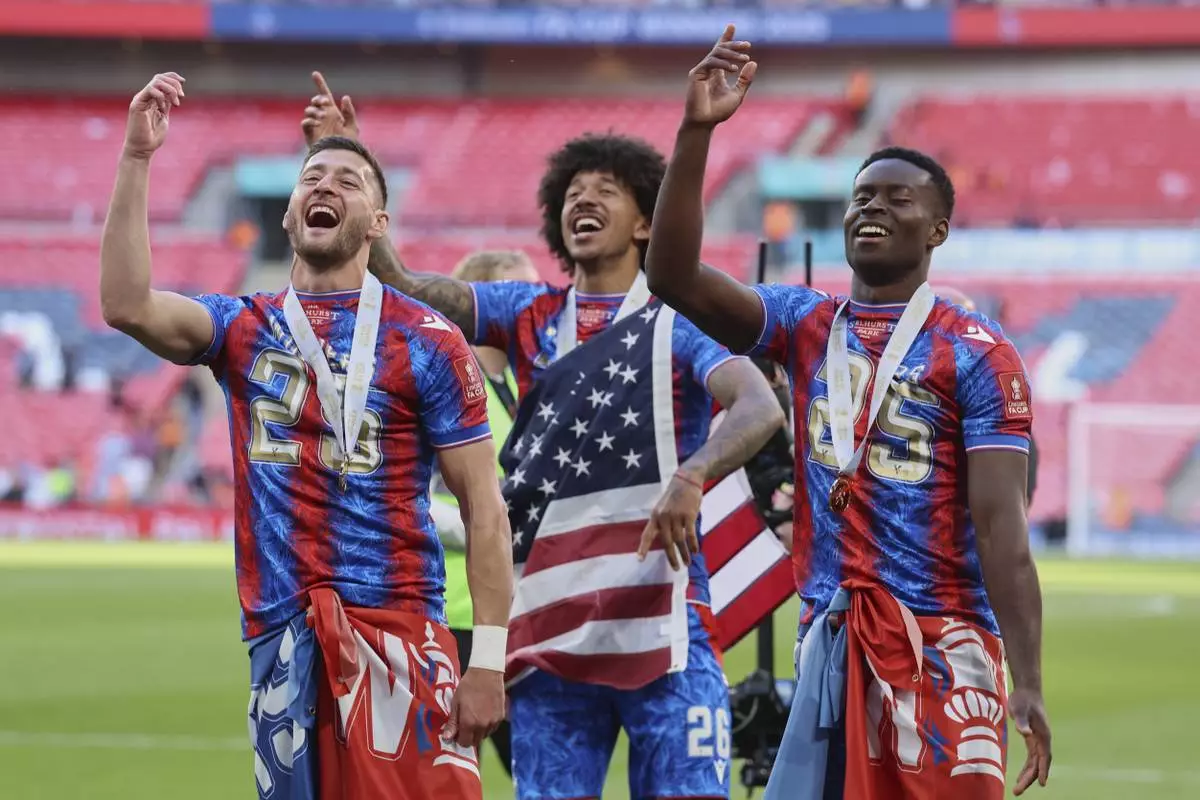 Crystal Palace players celebrate after the FA Cup final between Manchester City and Crystal Palace at the Wembley Stadium in London, Saturday, May 17, 2025. (AP Photo/Ian Walton)