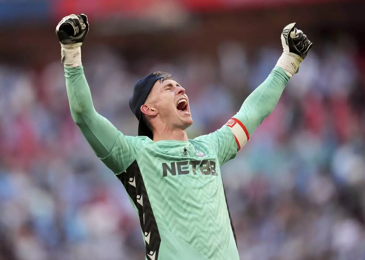 Crystal Palace goalkeeper Dean Henderson celebrates after the English FA Cup final soccer match between Crystal Palace and Manchester City at Wembley stadium in London, Saturday, May 17, 2025. (Adam Davy/PA via AP)