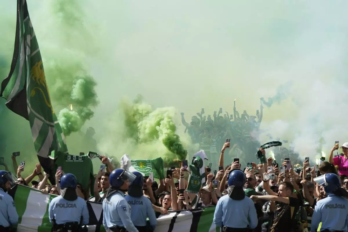Police keep an eye on Sporting supporters outside the stadium ahead of the Portuguese league last round soccer match between Sporting CP and Vitoria SC at the Alvalade stadium in Lisbon, Saturday, May 17, 2025. (AP Photo/Ana Brigida)