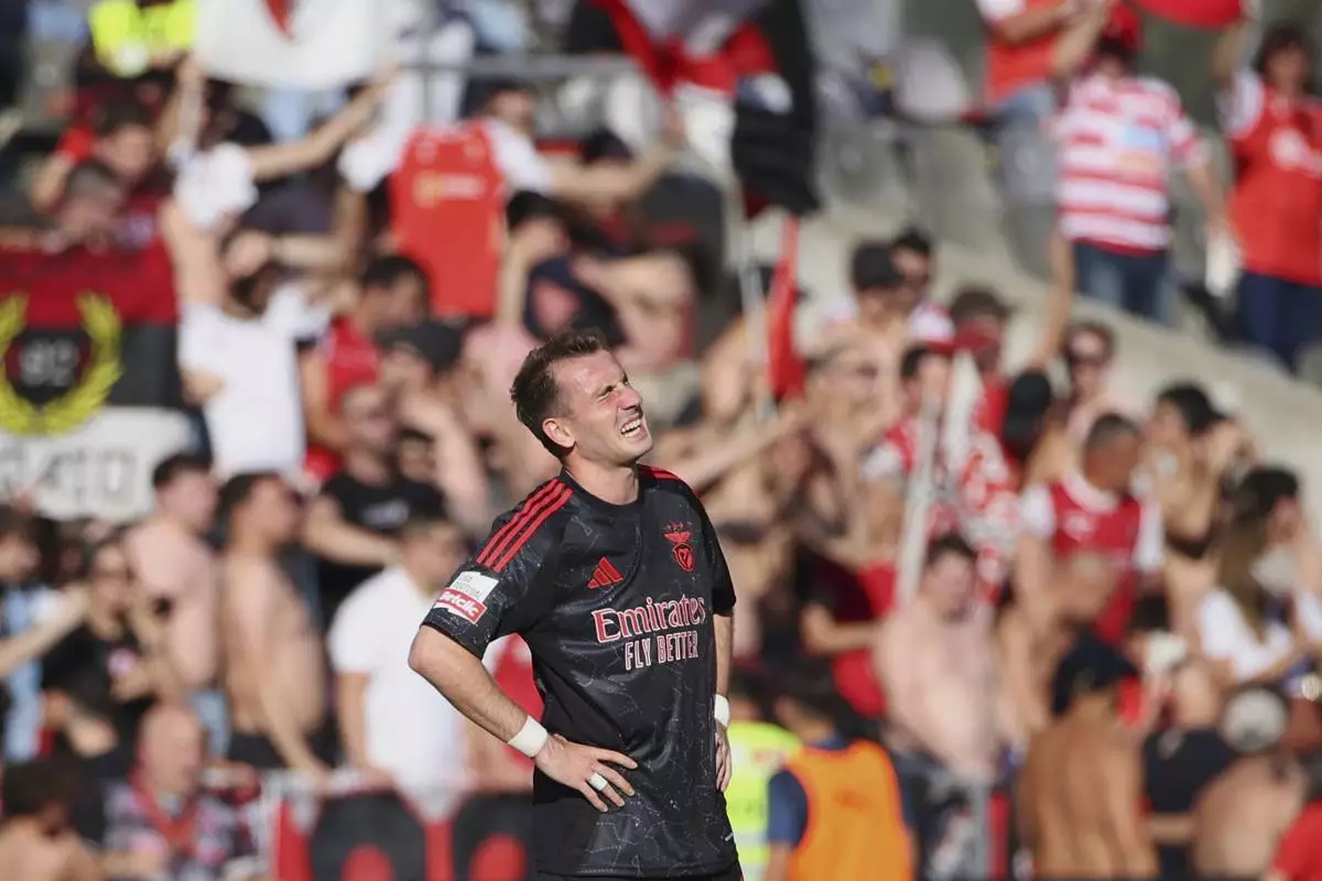 Benfica fell behind early at Braga when Rodrigo Zalazar converted a penalty in the 23rd. Vangelis Pavlidis leveled for Benfica in the 63rd after substitute Angel Di Maria set him up shortly after going on.