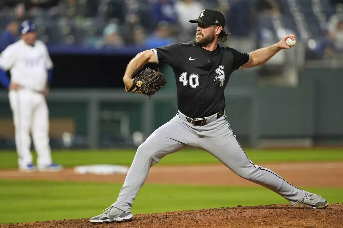 Chicago White Sox relief pitcher Tyler Gilbert throws during the seventh inning of a baseball game against the Kansas City Royals, Wednesday, May 7, 2025, in Kansas City, Mo. (AP Photo/Charlie Riedel)