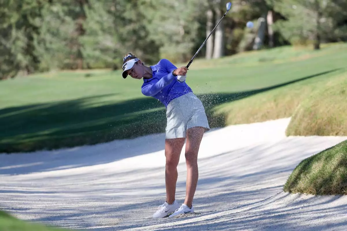 Nelly Korda hits from a bunker on the 14th hole during the first round of the Aramco Championship golf tournament Thursday, April 2, 2026, in North Las Vegas, Nev. (AP Photo/Ian Maule)
