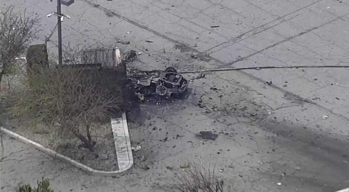 Debris covers the ground and around a vehicle after an explosion on Saturday, May 17, 2025 in Palm Springs, Calif. (ABC7 Los Angeles via AP)