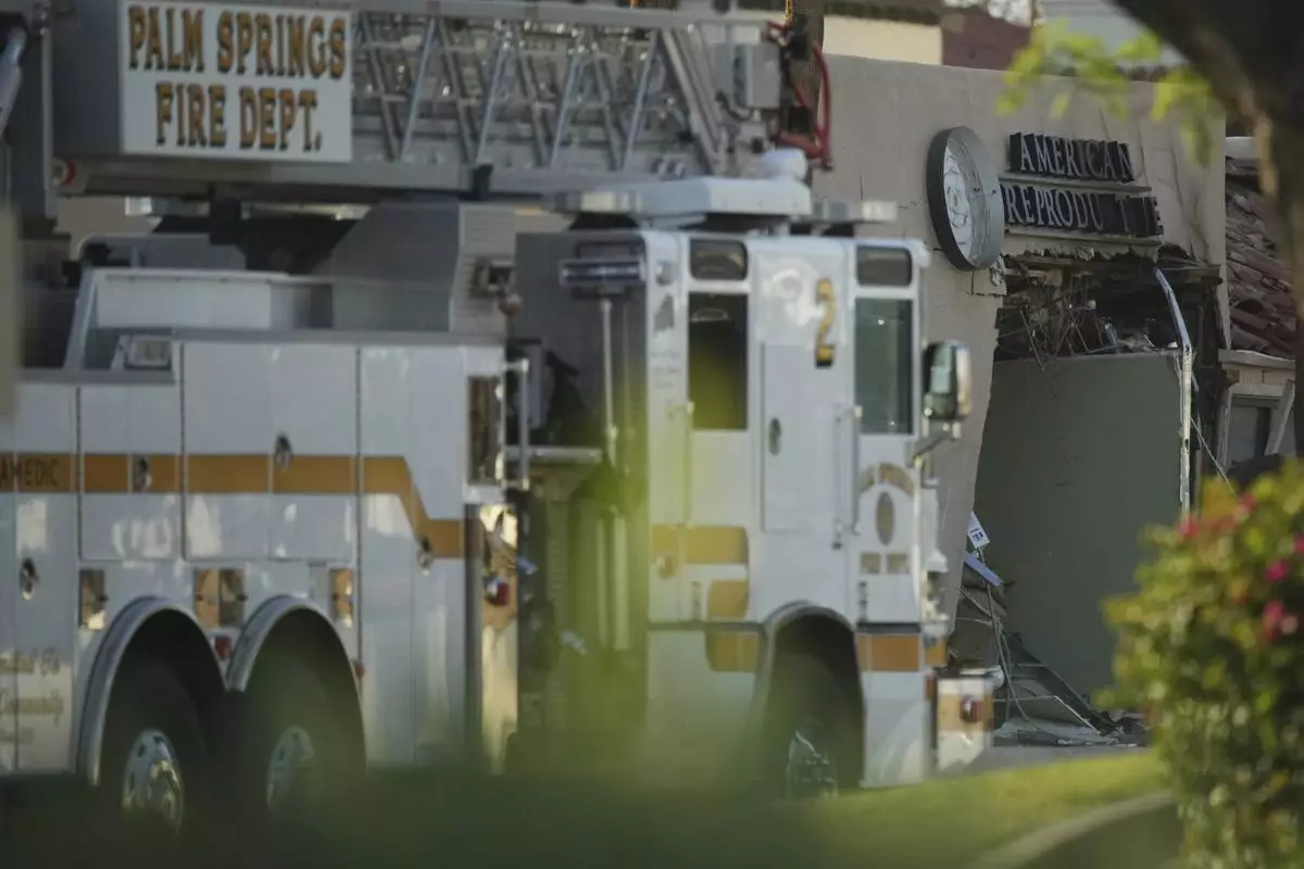 A fire truck is stationed near a building damaged in an explosion in Palm Springs, Calif., on Saturday, May 17, 2025. (AP Photo/Eric Thayer)