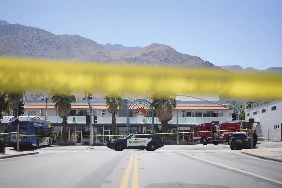 Police tape is placed across a street after an explosion Saturday, May 17, 2025, in Palm Springs, Calif. (AP Photo/Eric Thayer)