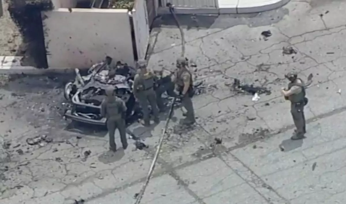 Law enforcement investigate a vehicle after an explosion on Saturday, May 17, 2025 in Palm Springs, Calif. (ABC7 Los Angeles via AP)