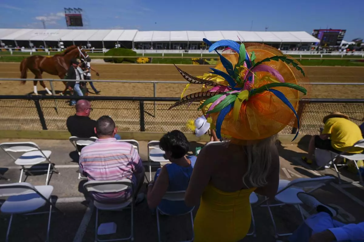 Brandy Lee, of Delray Beach, Fla., wears a decorative hat as a horse parades ahead of the 150th running of the Preakness Stakes horse race Saturday, May 17, 2025, at Pimlico Race Course in Baltimore. (AP Photo/Julio Cortez)