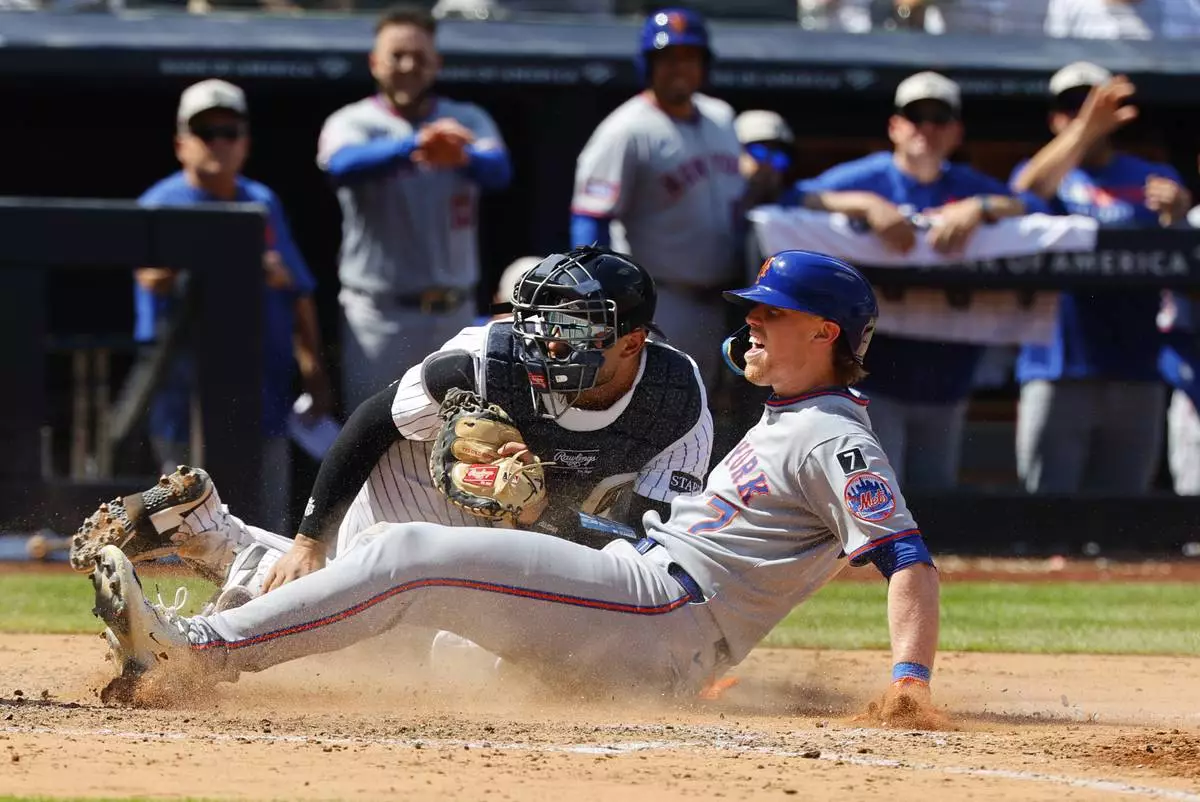 New York Mets' Brett Baty (7) reacts after being tagged out by New York Yankees catcher J.C. Escarra at home plate during the seventh inning of a baseball game, Saturday, May 17, 2025, in New York. (AP Photo/Noah K. Murray)