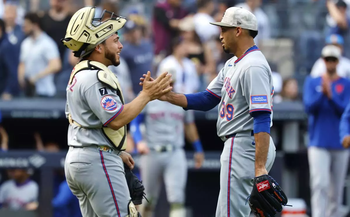 New York Mets catcher Luis Torrens (13) and pitcher Edwin Díaz (39) celebrate after defeating the New York Yankees following a baseball game, Saturday, May 17, 2025, in New York. (AP Photo/Noah K. Murray)