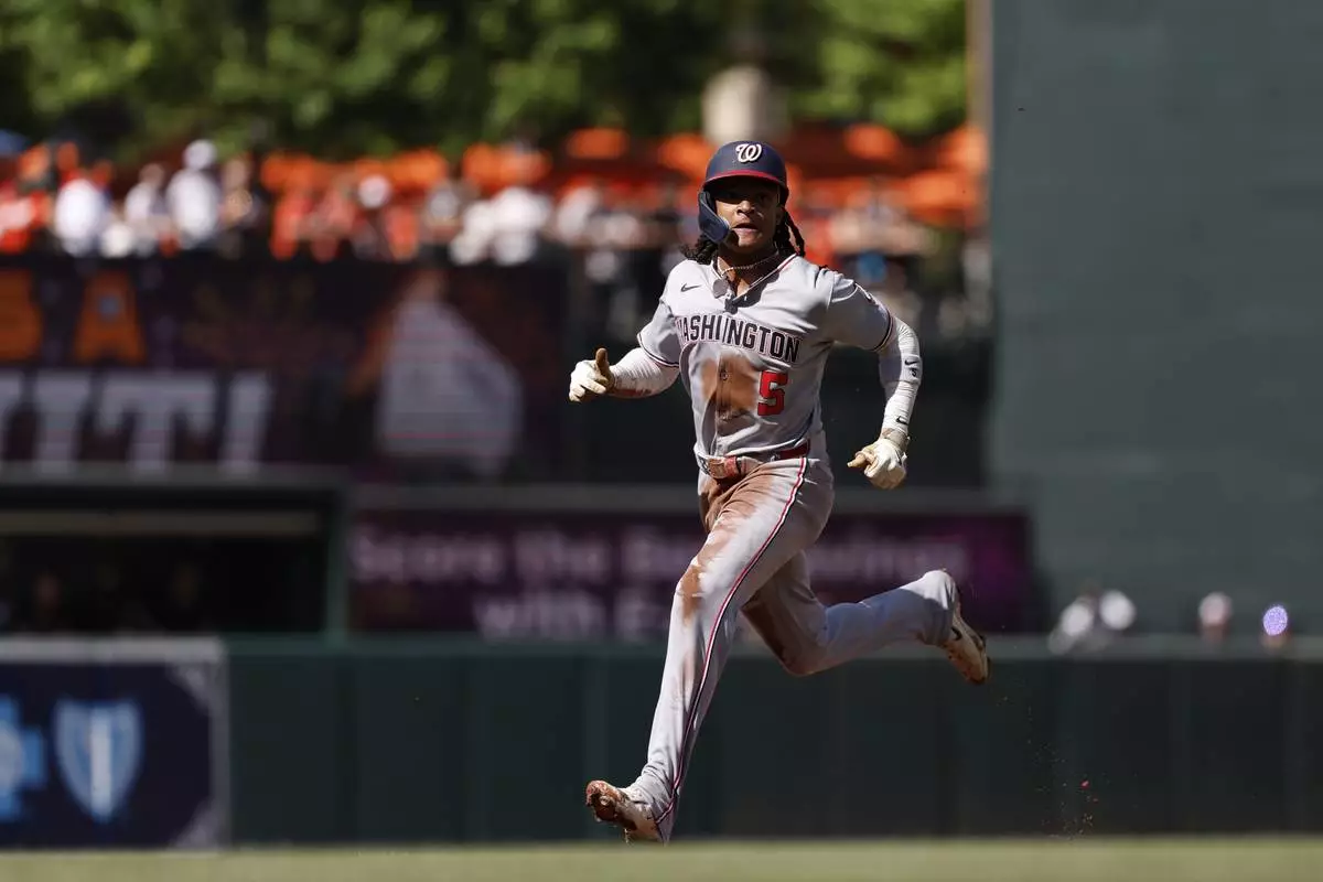 Washington Nationals' CJ Abrams advances to third base on a wild pitch by Baltimore Orioles' Kyle Gibson during the first inning of a baseball game in Baltimore, Saturday, May 17, 2025. (AP Photo/Terrance Williams)