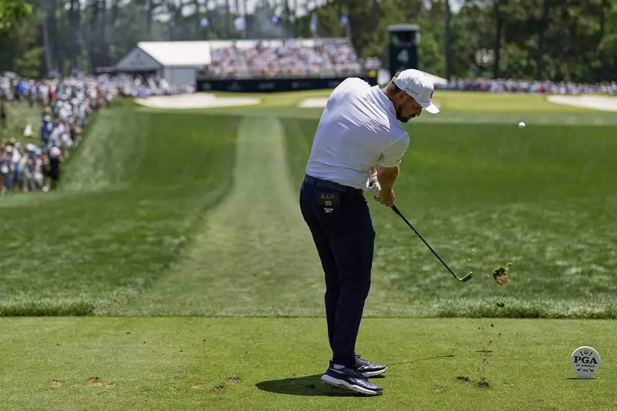 Bryson DeChambeau hits from the fairway on the seventh hole during the third round of the PGA Championship golf tournament at the Quail Hollow Club, Saturday, May 17, 2025, in Charlotte, N.C. (AP Photo/Matt York)