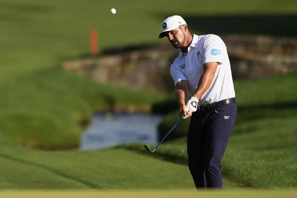 Bryson DeChambeau chips to the green on the 18th hole during the third round of the PGA Championship golf tournament at the Quail Hollow Club, Saturday, May 17, 2025, in Charlotte, N.C. (AP Photo/Matt York)
