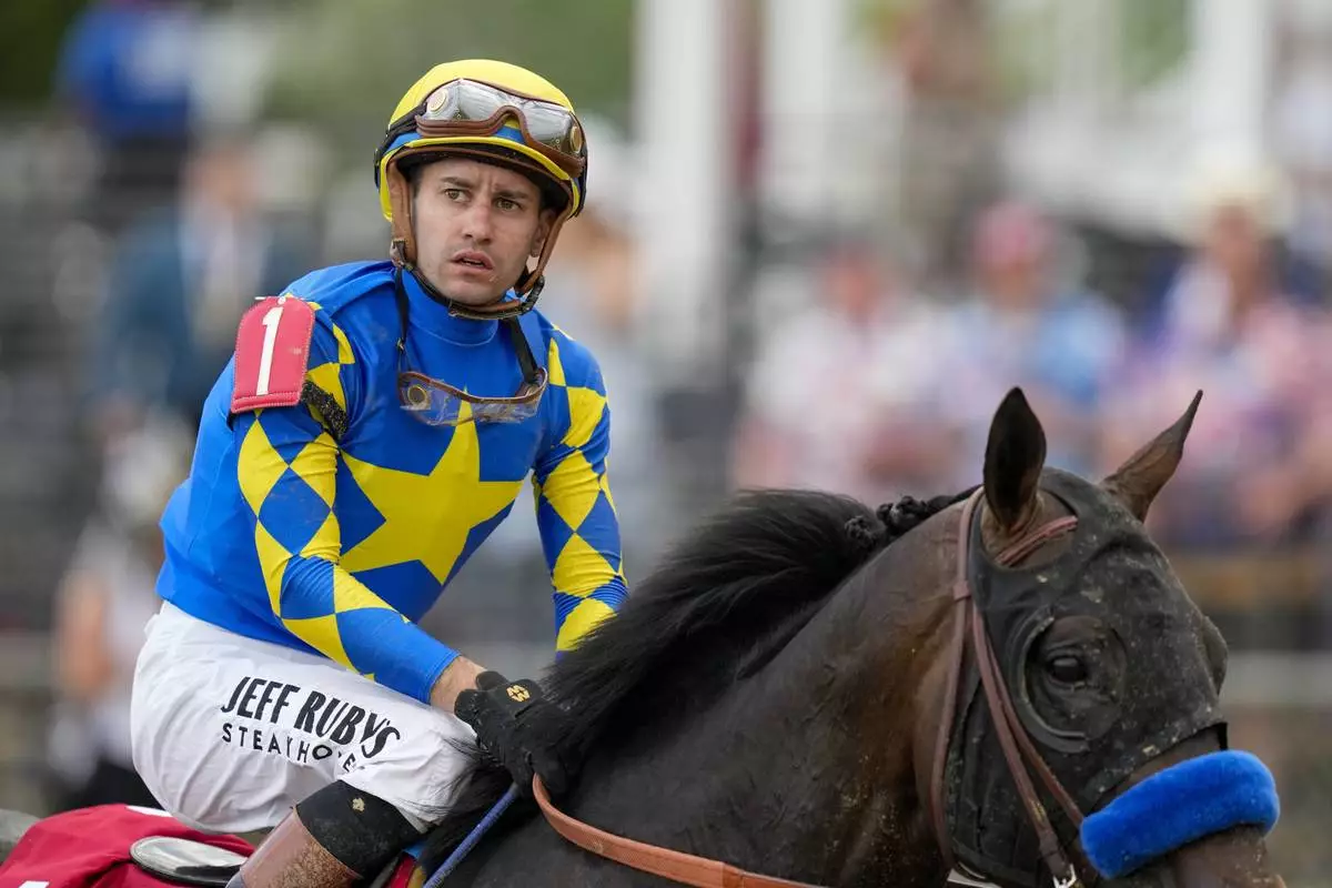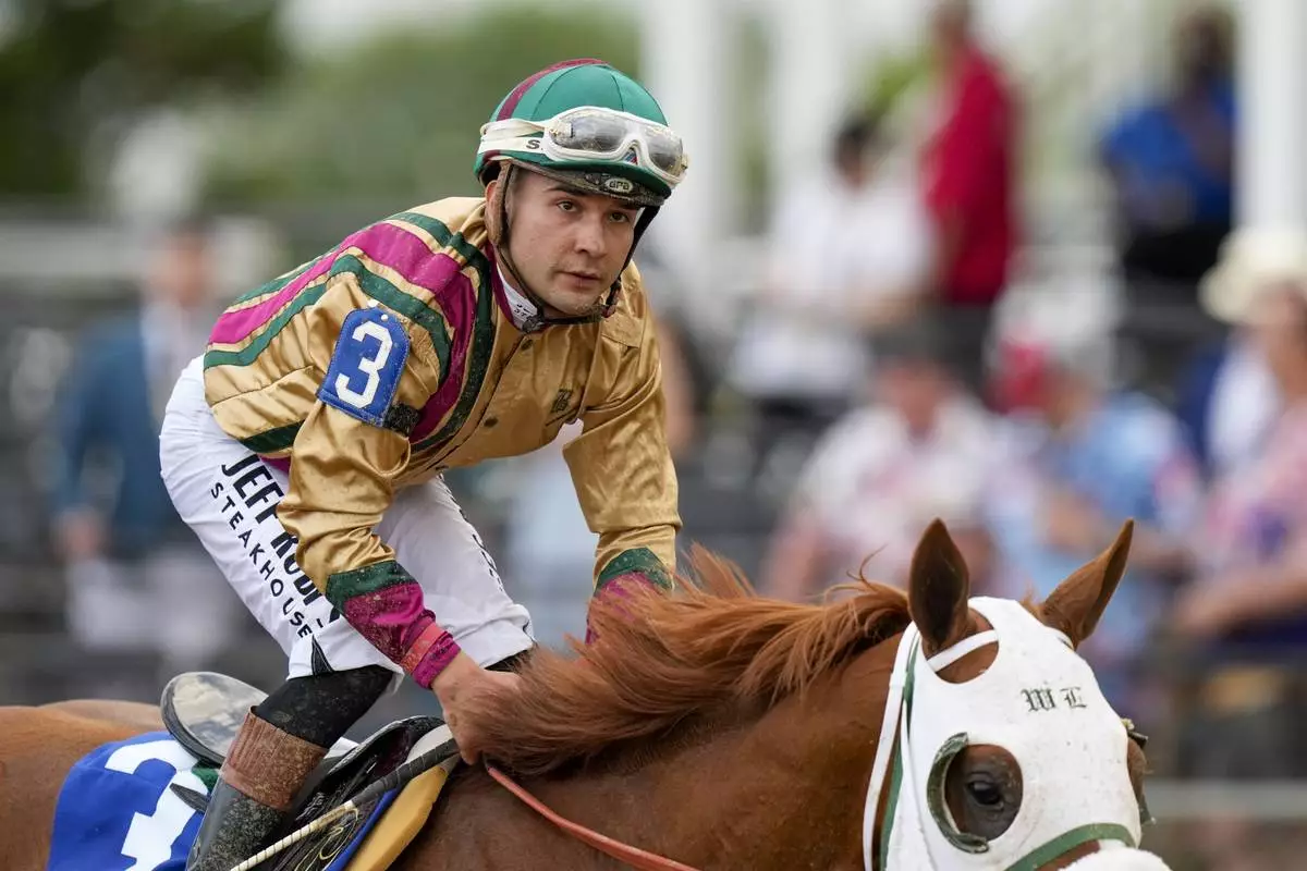 Flavien Prat, atop Goal Oriented, looks on after participating in the 150th running of the Preakness Stakes horse race Saturday, May 17, 2025, at Pimlico Race Course in Baltimore. (AP Photo/Stephanie Scarbrough)