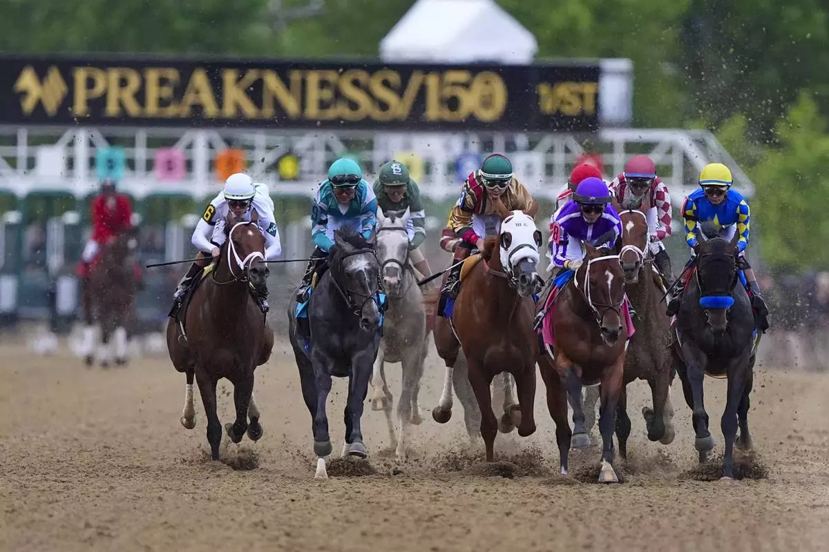 Jockeys compete during the 150th running of the Preakness Stakes horse race Saturday, May 17, 2025, at Pimlico Race Course in Baltimore. (AP Photo/Nick Wass)