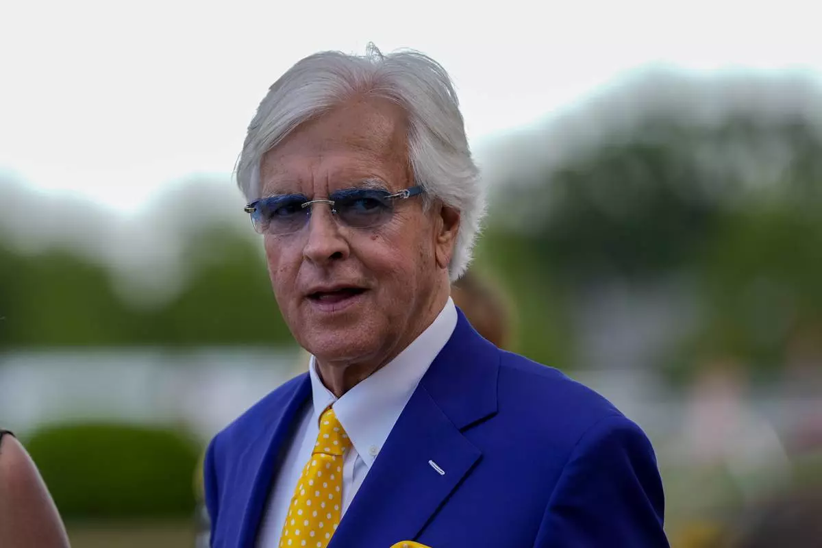 Goal Oriented's trainer Bob Bafert looks on prior to the 150th running of the Preakness Stakes horse race Saturday, May 17, 2025, at Pimlico Race Course in Baltimore. (AP Photo/Julia Demaree Nikhinson)