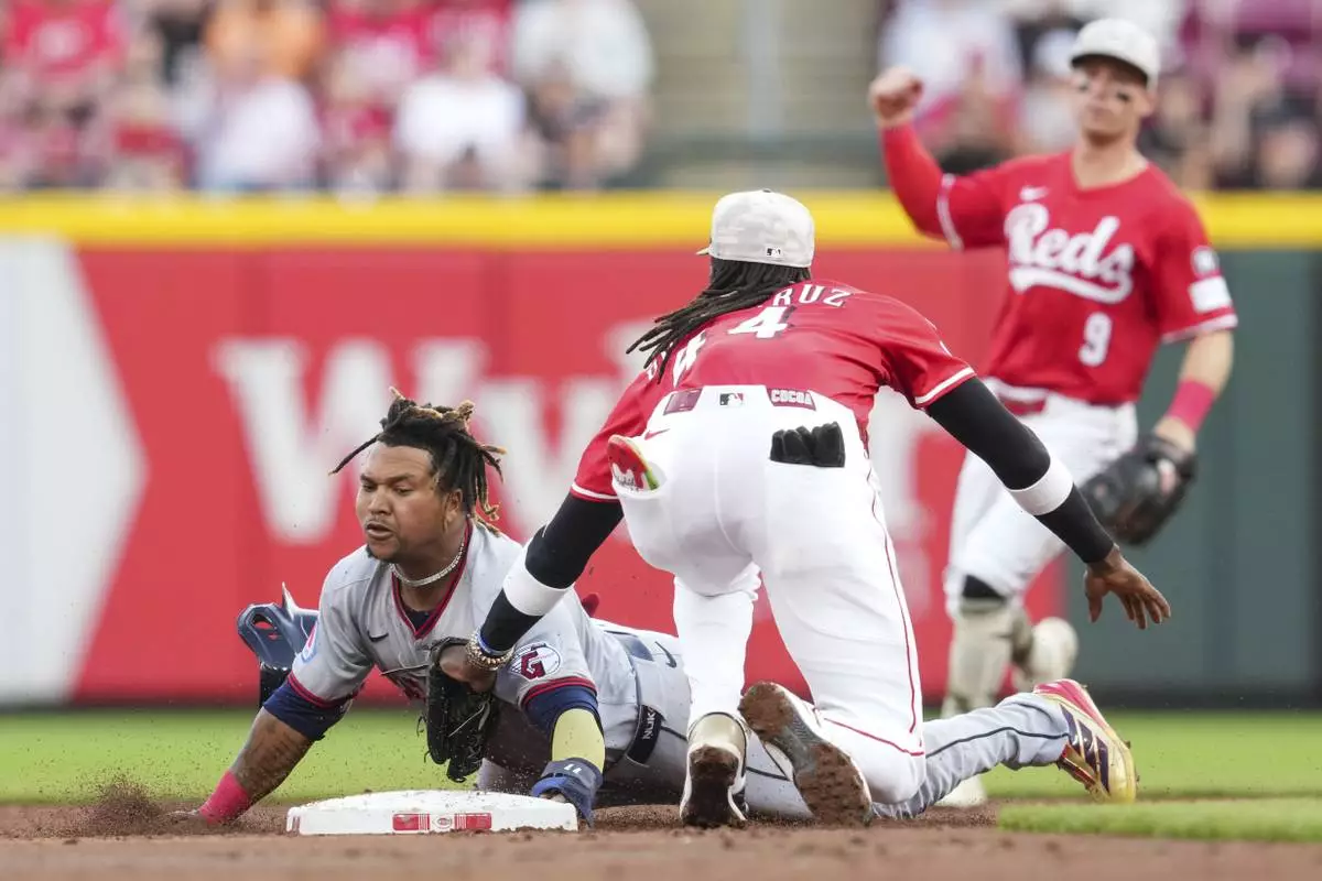 Cleveland Guardians' José Ramírez, left, is caught stealing second base by Cincinnati Reds shortstop Elly De La Cruz (44) during the third inning of a baseball game, Saturday, May 17, 2025, in Cincinnati. (AP Photo/Jeff Dean)