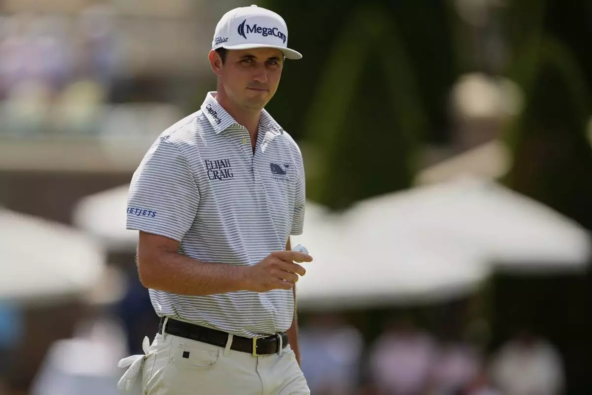 J.T. Poston waves after making a putt on the seventh hole during the third round of the PGA Championship golf tournament at the Quail Hollow Club, Saturday, May 17, 2025, in Charlotte, N.C. (AP Photo/Matt York)