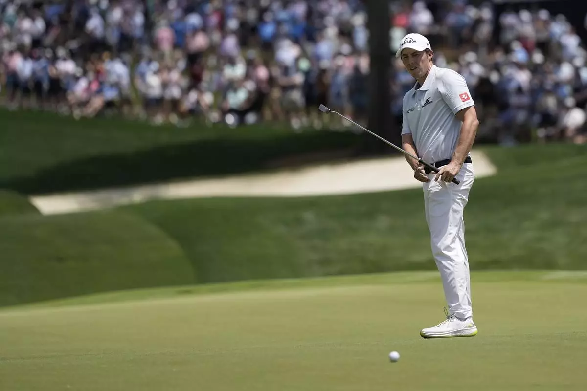 Matthew Fitzpatrick, of England, reacts after missing a putt on the first hole during the third round of the PGA Championship golf tournament at the Quail Hollow Club, Saturday, May 17, 2025, in Charlotte, N.C. (AP Photo/David J. Phillip)